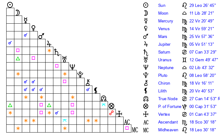| Venus | 15 Virgo 0 | 26 Cancer 27 | 24 Sagittarius 25 |