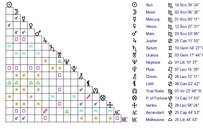 | Moon | 2 Scorpio 3 | 16 Gemini 2 | 13 Scorpio 30 |