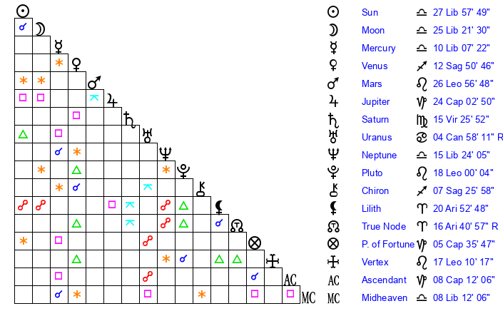 | Sun | 27 Libra 58 | 28 Libra 33 | 14 Capricorn 48 |