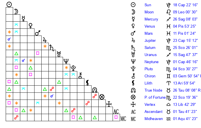 | Neptune | 1 Capricorn 46 | 27 Pisces 25 | 3 Capricorn 2 |