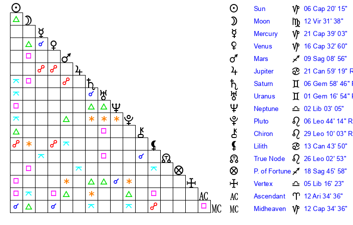 | Venus | 16 Capricorn 34 | 5 Capricorn 4 | 29 Aries 44 |