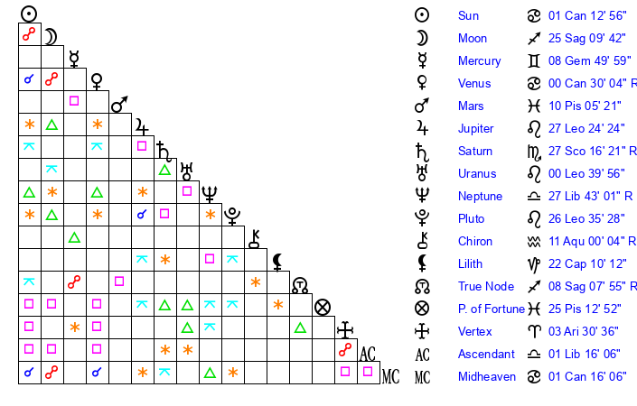 | Moon | 25 Sagittarius 3 | 23 Taurus 52 | 27 Gemini 2 |