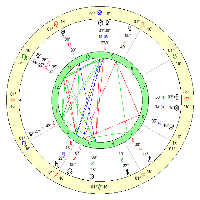 | Sun | 1 Cancer 13 | 1 Cancer 31 | 7 Virgo 16 |