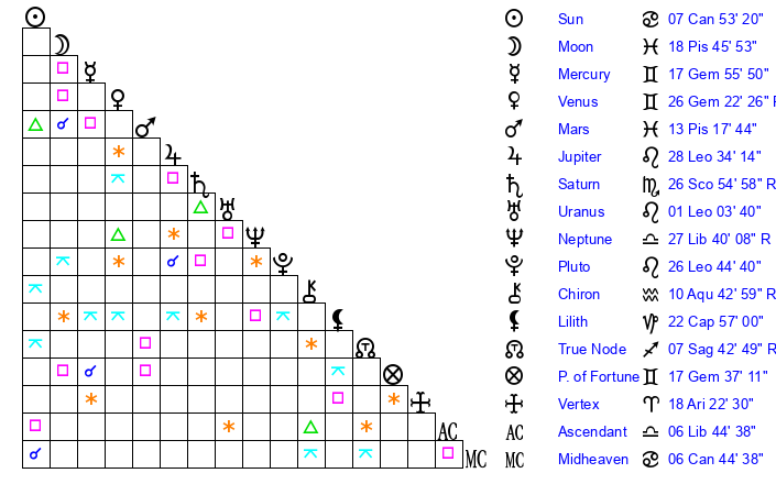 | Mercury | 17 Gemini 56 | 3 Leo 37 | 9 Libra 59 |