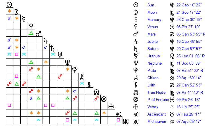 | Sun | 22 Capricorn 16 | 22 Capricorn 30 | 27 Pisces 52 |