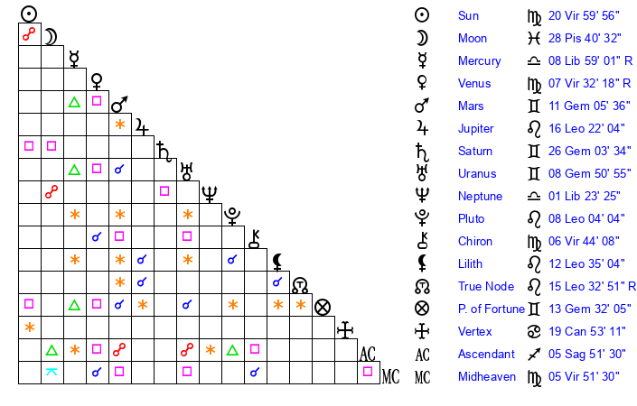 | Saturn | 26 Gemini 23 | 28 Pisces 53 | 24 Gemini 20 |