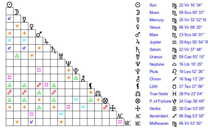 | Sun | 22 Virgo 16 | 23 Virgo 6 | 6 Sagittarius 55 |