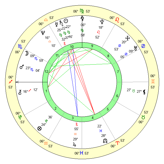 | Moon | 9 Scorpio 53 | 9 Cancer 23 | 2 Leo 32 |