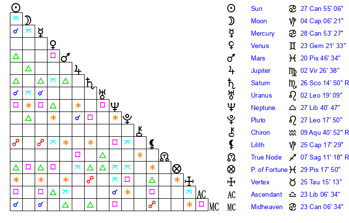 | Moon | 4 Capricorn 4 | 3 Gemini 54 | 7 Cancer 28 |
