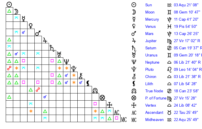 | Neptune | 6 Libra 22 | 27 Pisces 44 | 4 Libra 34 |