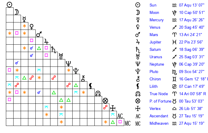 | Neptune | 6 Capricorn 39 | 27 Pisces 50 | 7 Capricorn 40 |