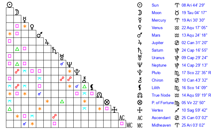 | Pluto | 17 Scorpio 22 | 3 Aquarius 31 | 16 Scorpio 29 |