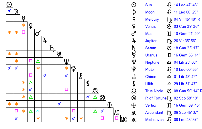 | Pluto | 10 Leo 1 | 2 Aquarius 15 | 11 Leo 44 |