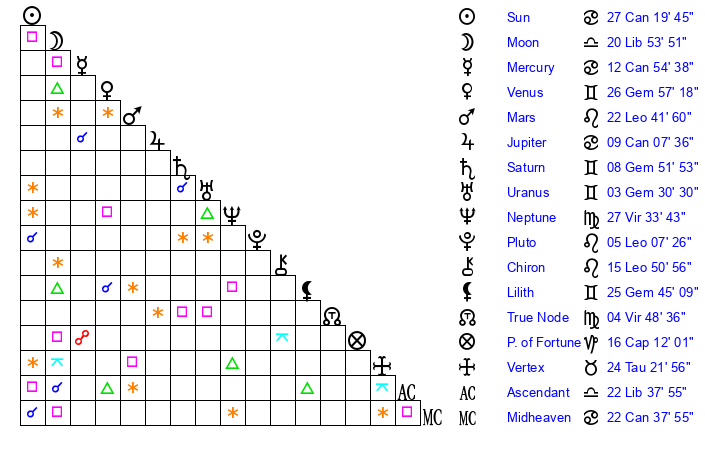 | Moon | 20 Libra 51 | 3 Gemini 54 | 7 Scorpio 44 |