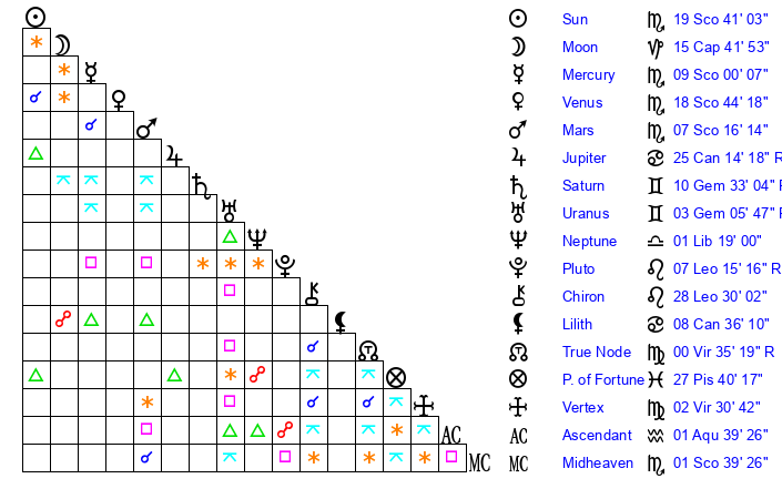 | Sun | 19 Scorpio 41 | 20 Scorpio 34 | 14 Aquarius 0 |