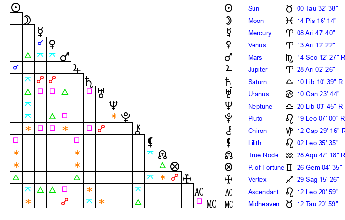 | Pluto | 19 Leo 6 | 3 Aquarius 46 | 19 Leo 57 |