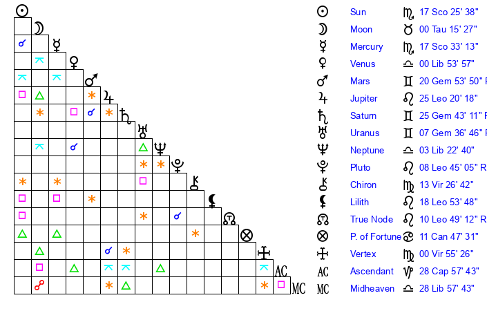 | Neptune | 3 Libra 24 | 29 Pisces 36 | 4 Libra 5 |