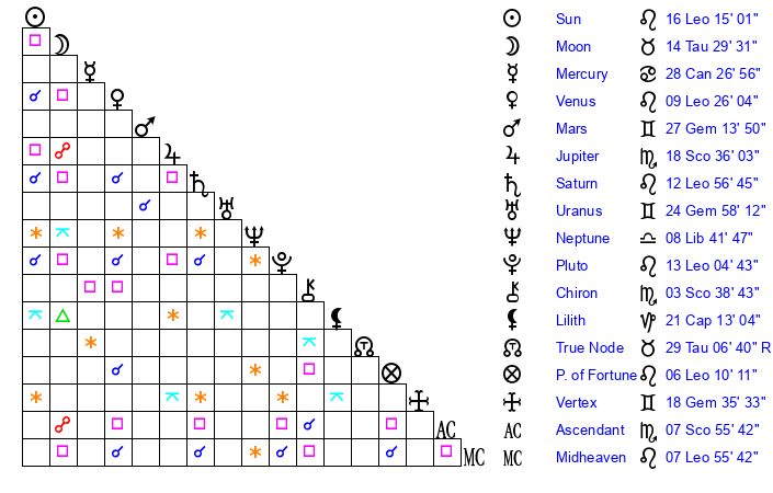 | Pluto | 13 Leo 4 | 2 Aquarius 13 | 14 Leo 50 |