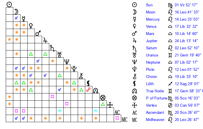 | Mercury | 14 Leo 33 | 16 Leo 6 | 7 Sagittarius 9 |