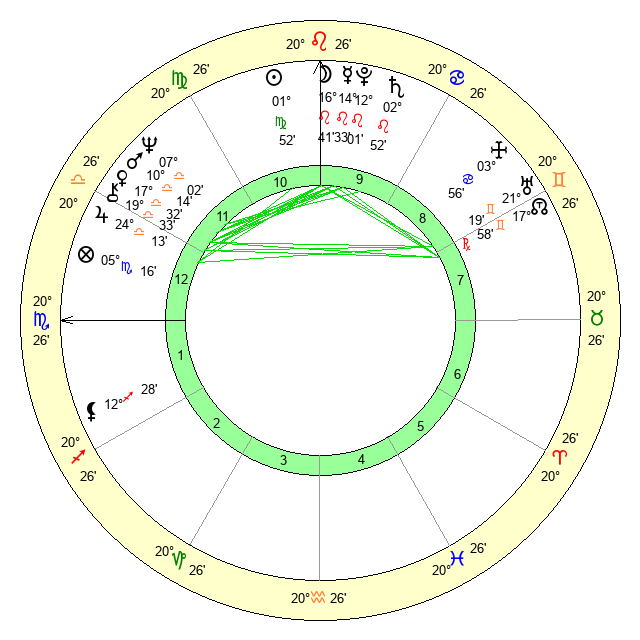 | Sun | 1 Virgo 52 | 2 Virgo 45 | 19 Scorpio 43 |