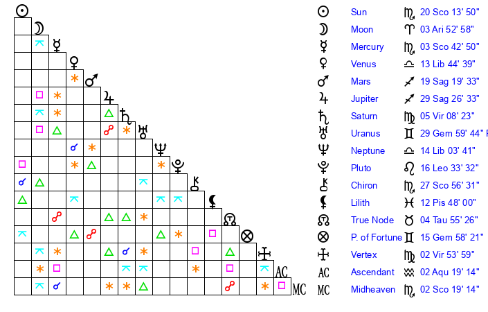 | Sun | 20 Scorpio 14 | 20 Scorpio 34 | 8 Aquarius 28 |