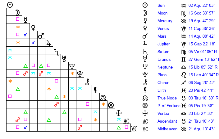 | Moon | 16 Scorpio 27 | 12 Scorpio 2 | 16 Leo 30 |