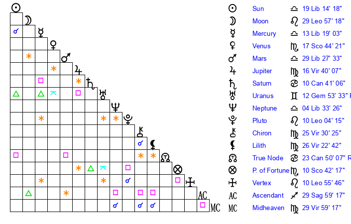 | Moon | 29 Leo 58 | 5 Cancer 58 | 17 Leo 42 |