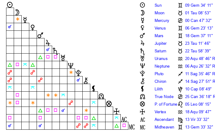 | Sun | 9 Gemini 34 | 9 Gemini 32 | 3 Cancer 28 |