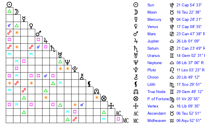 | Moon | 16 Taurus 33 | 7 Cancer 18 | 4 Aries 39 |