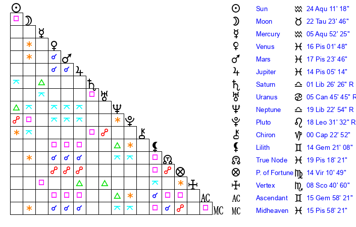 | Sun | 24 Aquarius 11 | 25 Aquarius 15 | 7 Taurus 36 |