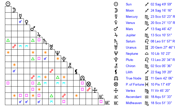 | Moon | 24 Sagittarius 17 | 3 Aquarius 30 | 20 Scorpio 50 |