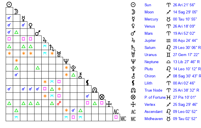 | Pluto | 14 Leo 9 | 3 Aquarius 44 | 15 Leo 4 |