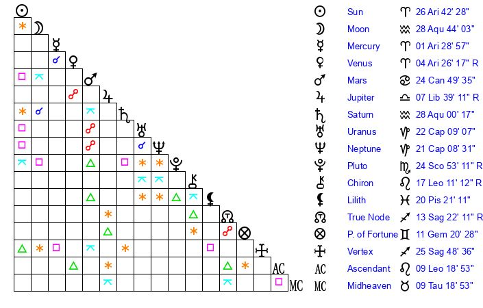 | Venus | 4 Aries 26 | 24 Pisces 54 | 14 Aries 26 |