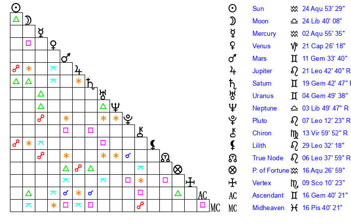| Saturn | 20 Gemini 3 | 18 Pisces 54 | 24 Gemini 41 |