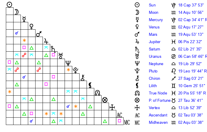| Neptune | 19 Libra 29 | 29 Pisces 37 | 18 Libra 32 |