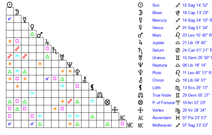 | Sun | 15 Sagittarius 15 | 15 Sagittarius 50 | 6 Pisces 30 |