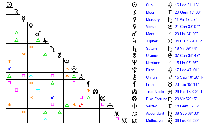 | Sun | 16 Leo 31 | 17 Leo 21 | 29 Libra 43 |