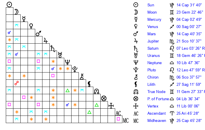 | Sun | 14 Capricorn 32 | 15 Capricorn 22 | 4 Aries 12 |