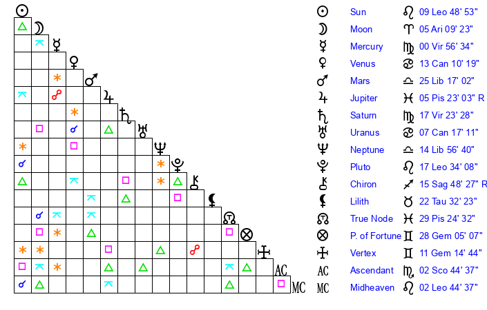 | Mercury | 0 Virgo 57 | 7 Leo 45 | 11 Libra 43 |