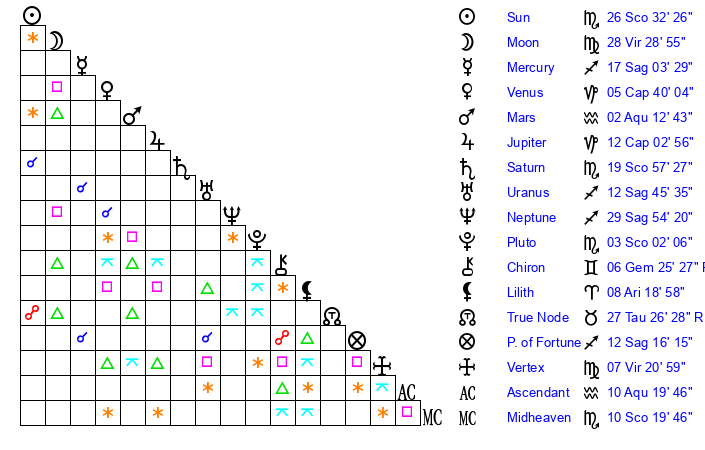 | Saturn | 20 Scorpio 14 | 25 Pisces 8 | 24 Scorpio 47 |