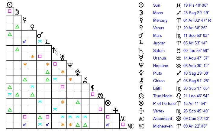 | Moon | 23 Sagittarius 20 | 9 Leo 35 | 7 Sagittarius 44 |