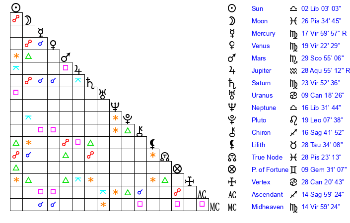 | Moon | 26 Pisces 27 | 15 Scorpio 55 | 21 Sagittarius 31 |