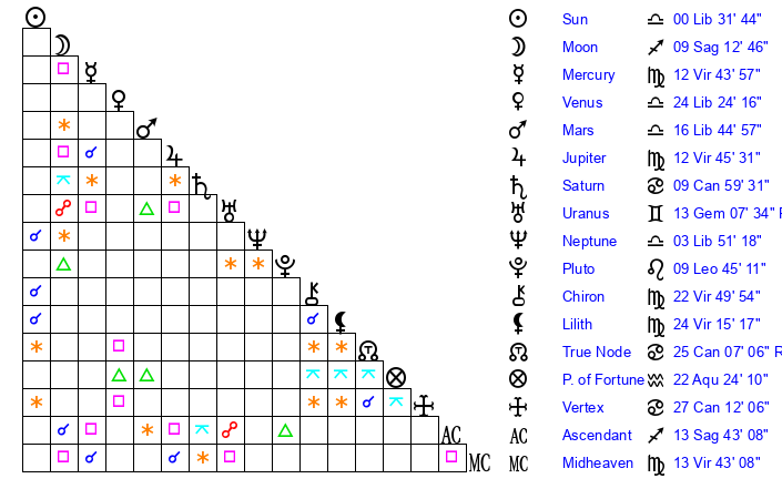 | Sun | 0 Libra 32 | 0 Libra 55 | 21 Sagittarius 35 |