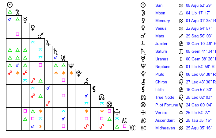 | Sun | 5 Aquarius 53 | 7 Aquarius 0 | 27 Aries 47 |