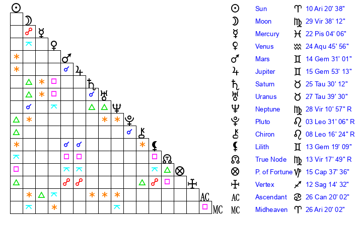 | Neptune | 28 Virgo 11 | 0 Aries 2 | 27 Virgo 10 |