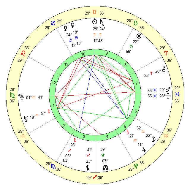 | Sun | 29 Gemini 12 | 29 Gemini 37 | 18 Leo 52 |