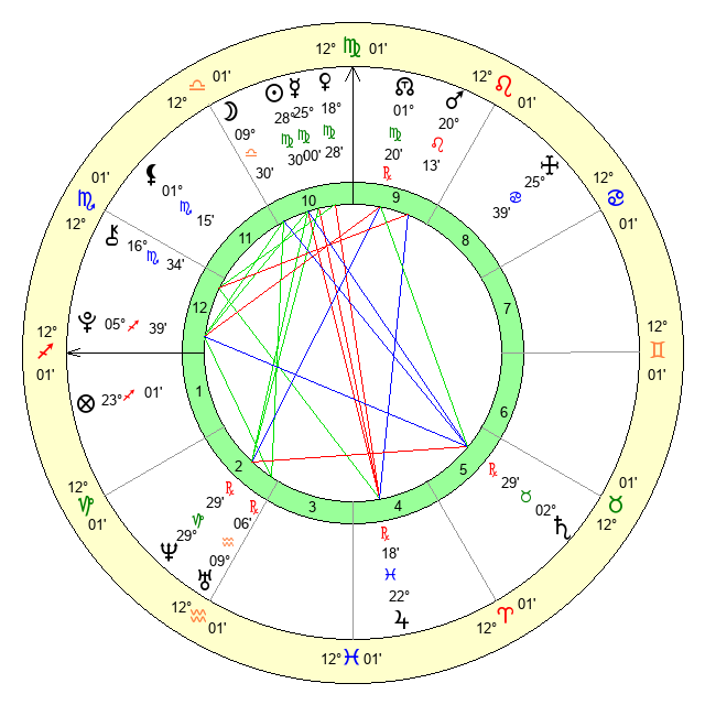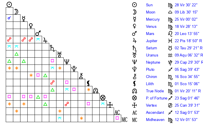 | Moon | 9 Libra 28 | 27 Virgo 27 | 6 Libra 22 |