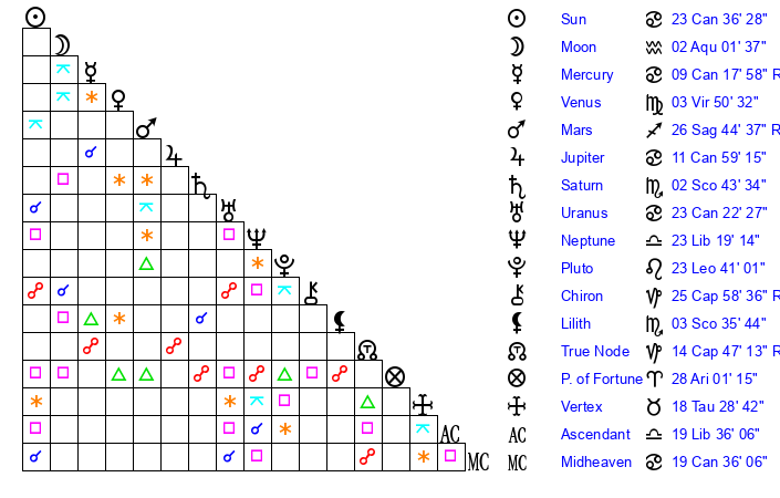 | Sun | 23 Cancer 36 | 24 Cancer 25 | 2 Libra 5 |