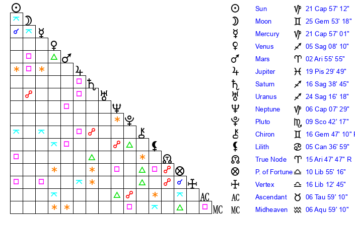 Sun | 21 Capricorn 57 | 22 Capricorn 45 | 0 Pisces 31 |