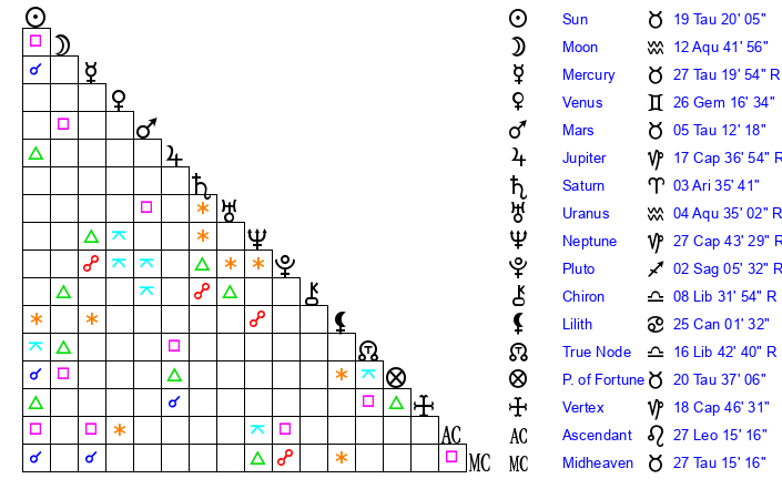 | Sun | 19 Taurus 20 | 19 Taurus 19 | 17 Gemini 12 |